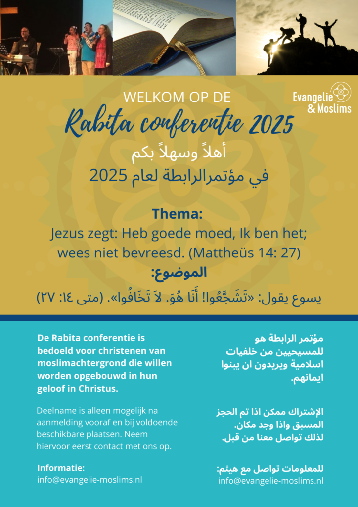 Hartelijke groet namens het team van Evangelie & Moslims, Cees Rentier - directeur | | | | | | | Rabita conferentie Van 25-28 april hopen we onze jaarlijkse Rabita conferentie te houden, waar we circa 250 deelnemers verwachten. Het programma is bedoeld voor Arabischtalige christenen met een moslimachtergrond, of hen die serieuze belangstelling hebben voor het christelijke geloof.